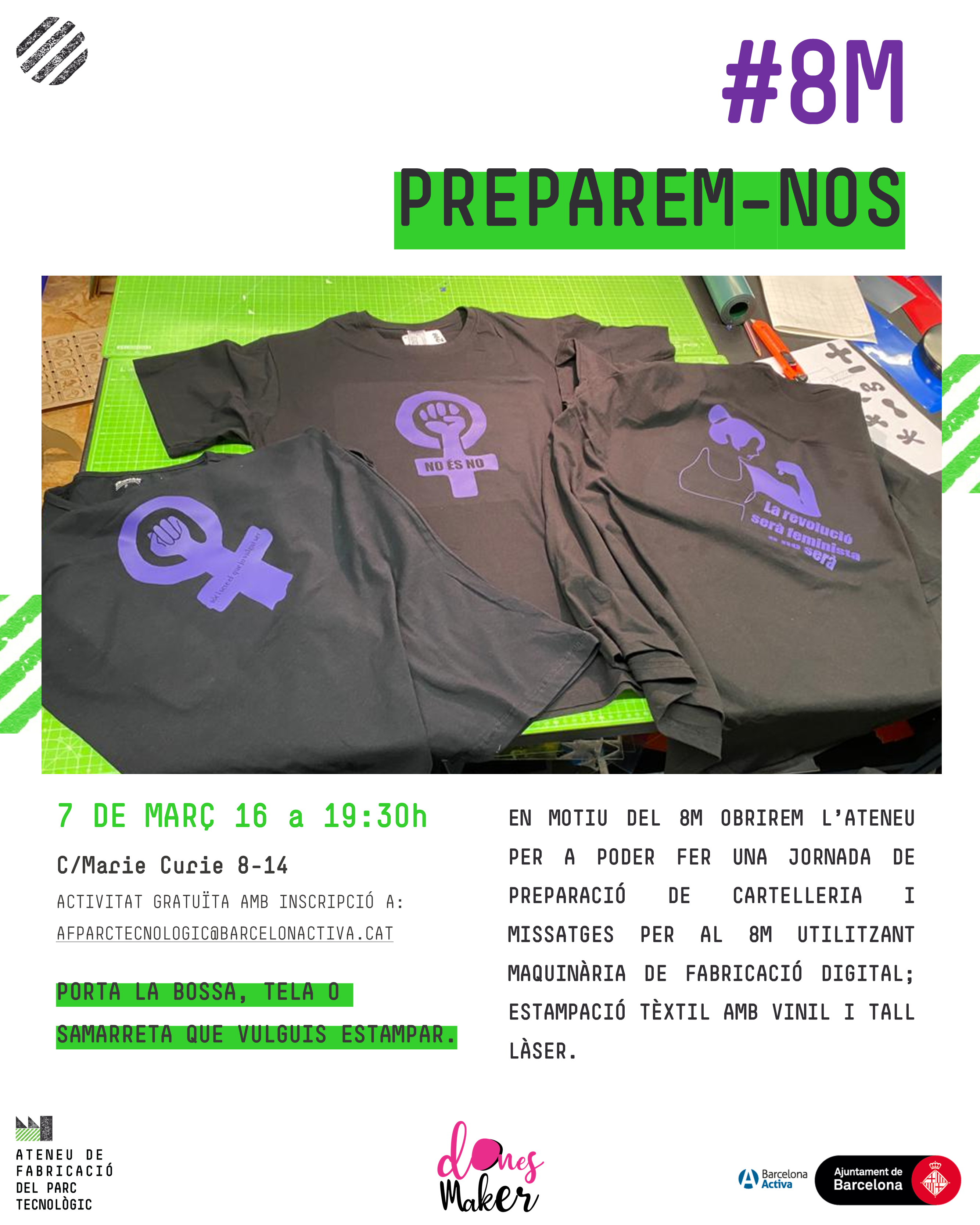 Obrim l'Ateneu de Fabricació del Parc Tecnològic per fer una jornada de preparació de cartelleria i missatges per al 8M utilitzant maquinària de fabricació digital (estampació tèxtil amb vinil i tall làser). Inscriu-te enviant un correu a afparctecnologic@barcelonactiva.cat.